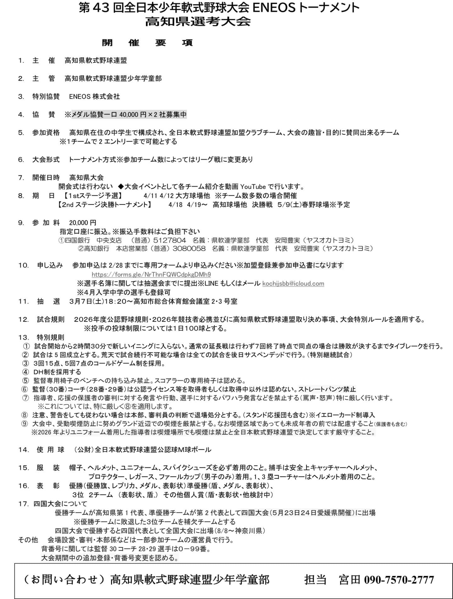 第43回全日本少年軟式野球大会ENEOSトーナメント高知県選考大会